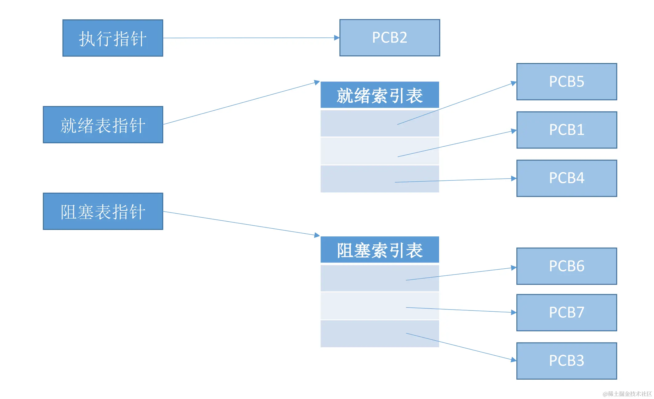 **执行指针:**指向当前处于运行态(执行态)的进程。单CPU计算机中,同一时刻只会有一个进程处于运行态。多核CPU可有多个进程同时处于运行态