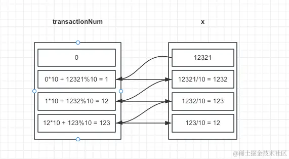 // 例如,当输入为 12321 时,在 while 循环的末尾我们可以得到 x = 12,revertedNumber = 123,