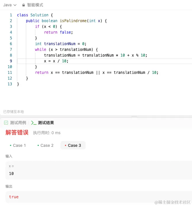 上边的代码报错了,当输入10时,会得出 10 是一个回数的结果