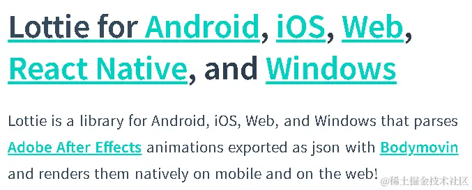 Lottie 是Airbnb开源的一个 面向iOS、Android、React Native 的动画库,能分析 AE 导出的动画(需要用bodymovin导出为json格式),并且能让原生 App 像使用静态素材一样使用这些动画,完美实现动画效果。