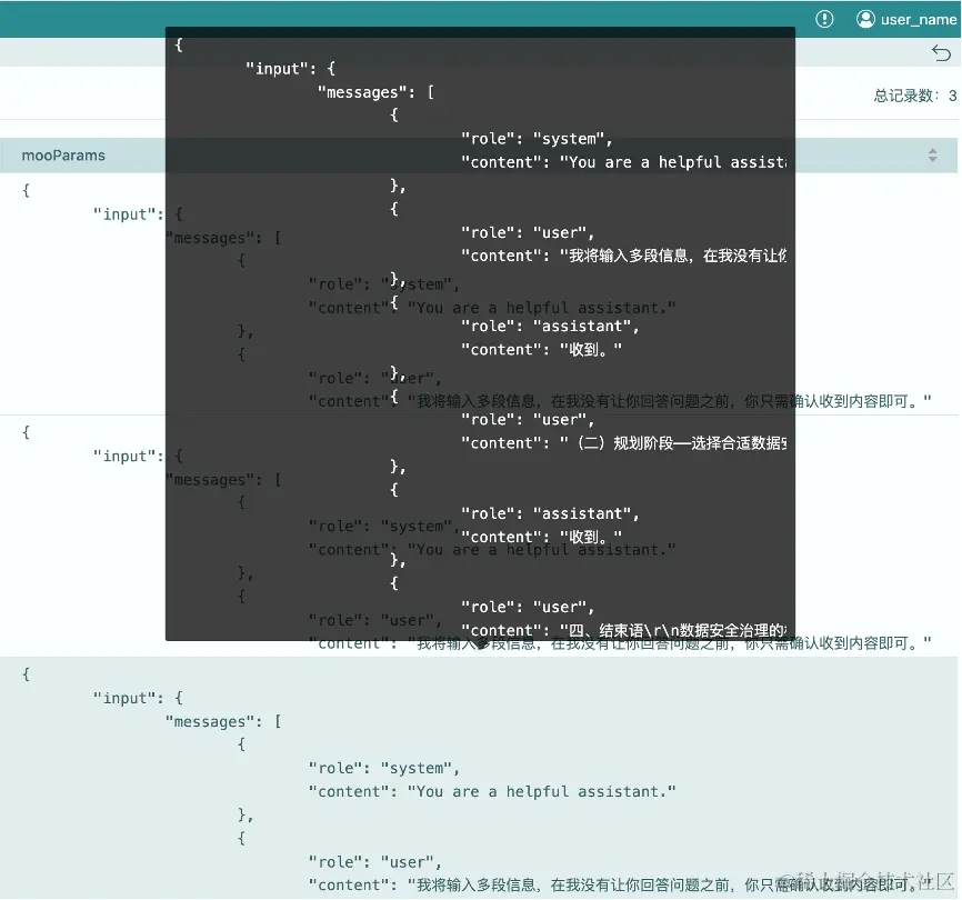 如“提示与回答”图所示,流程输出给通义千问三个Prompt,前两个Prompt大模型按照预期没有回答问题,并确认收到信息。在第三个提示输入后,其按照记忆给出了问题的答案,答案与方案一执行时获得的答案一致,回答成功。那么算子是如何提交会话信息,帮助通义千问实现短期记忆的呢?通过“API请求参数”的图片我们能够看到,历史的会话信息按照API接口的约定,每次都通过messages参数传递给了大模型。每次请求都会多一组上一轮的对话信息。