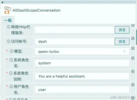 7.阿里会话大模型:该算子支持了通义千问大模型的多轮会话接口,即每次调用接口时,会将会话过程中的交互记录同步传输给大模型,大模型使用这种短期记忆模式回答相关的问题。很明显,该模式会大量的消耗tokens额度,会超越我们的第一个技术方案,因为每次调用接口都会加上前一次的会话内容,使得请求越来越大。但我们也看到业界有一些缩减会话大小的技巧,在此我们不展开讨论,有兴趣的朋友可以自行查阅。其配置界面如上图,一般情况下只要为其设置通义千问访问账号即可,其它参数缺省不用调整。下面我们看一下其结果输出。