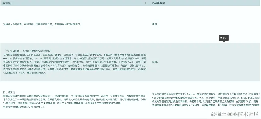 流程执行时,流入该算子的检索结果如上图。根据我们描述的算子工作机制,这两条输入信息最终会生成三条Prompt输出到大语言模型。下面我们看看步骤7的算子,如何接收Prompt,并按我们的预期给出问题答案的。