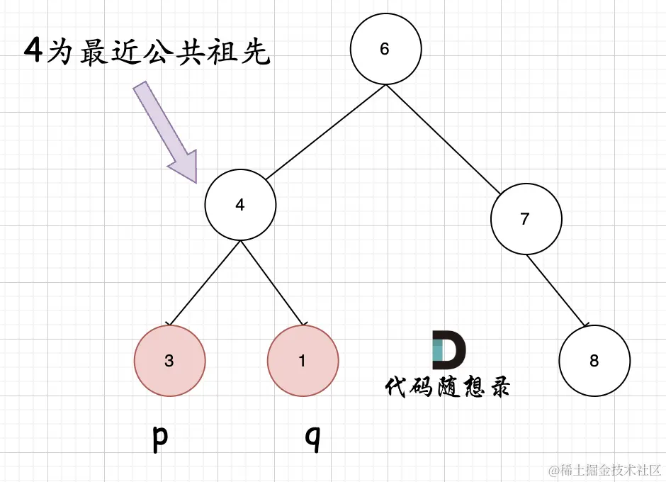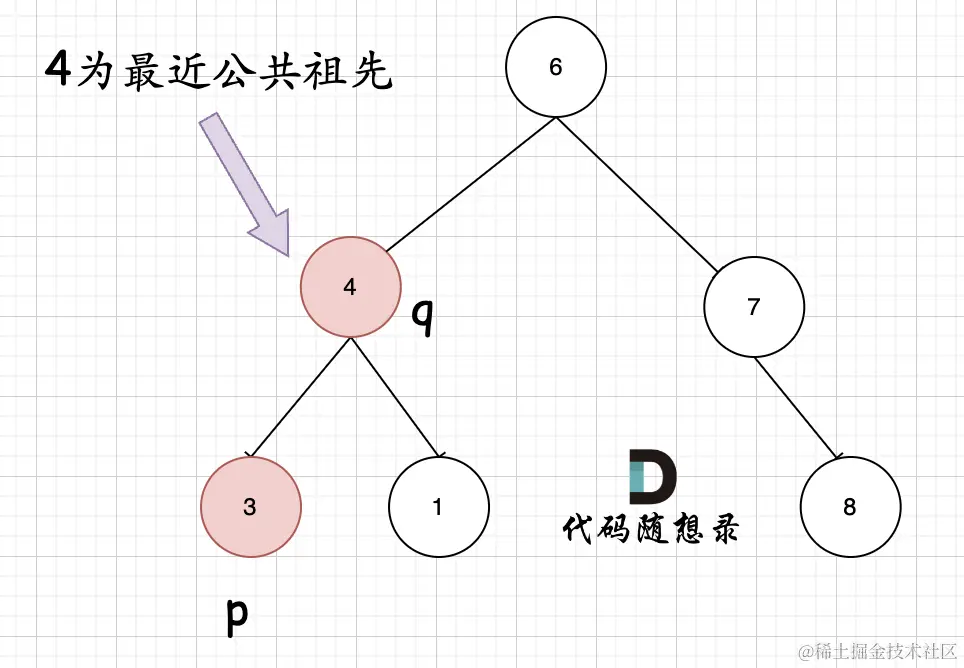因为遇到 q 或者 p 就返回,这样也包含了 q 或者 p 本身就是 公共祖先的情况。一因为在左子树碰到q或者p,那么如果右子树为空,那么左子树根节点就是所求的节点。