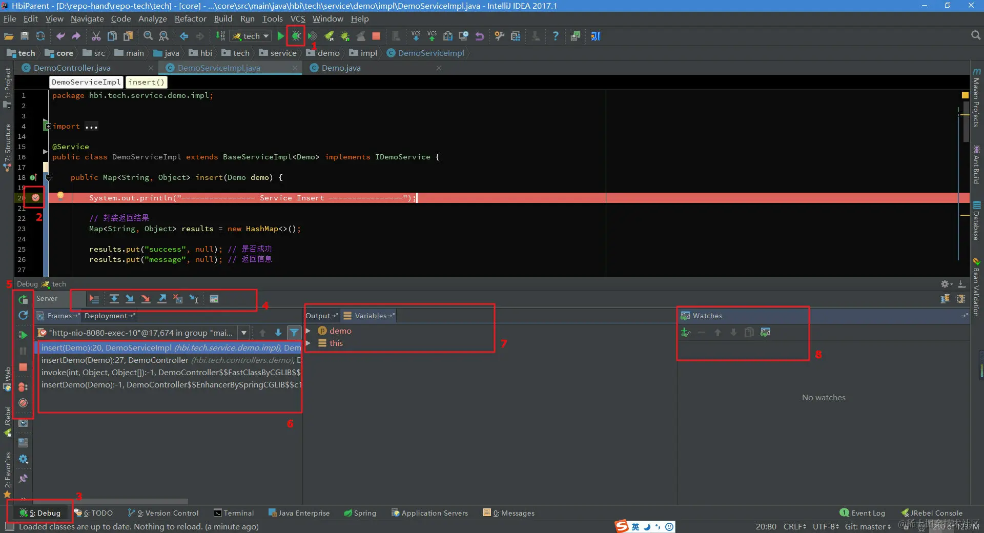 如下是在IDEA中启动Debug模式,进入断点后的界面,我这里是Windows,可能和Mac的图标等会有些不一样。就简单说下图中标注的8个地方: