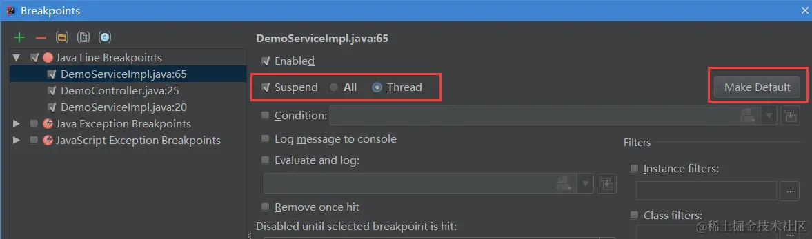 那是因为IDEA在Debug时默认阻塞级别是ALL,会阻塞其它线程,只有在当前调试线程走完时才会走其它线程。可以在View Breakpoints里选择Thread,如图7.1,然后点击Make Default设置为默认选项。