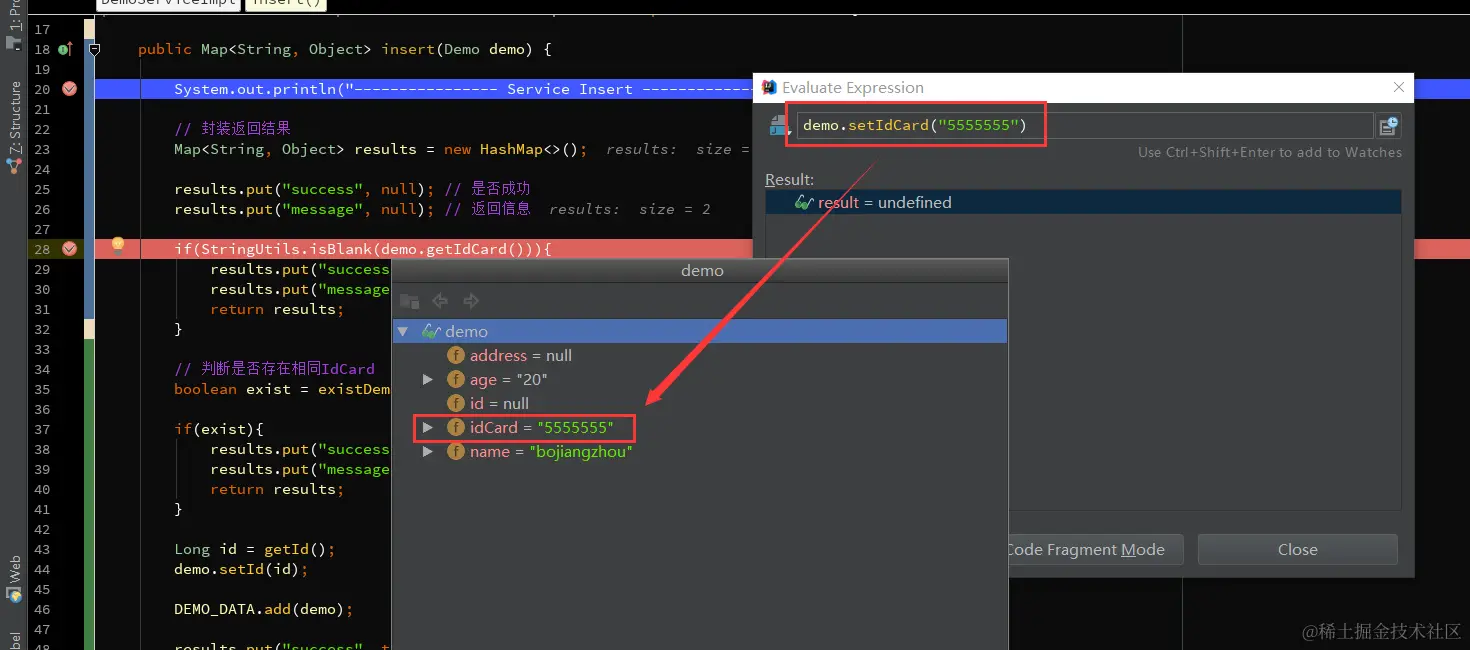 这个表达式不仅可以是一般变量或参数,也可以是方法,当你的一行代码中调用了几个方法时,就可以通过这种方式查看查看某个方法的返回值。