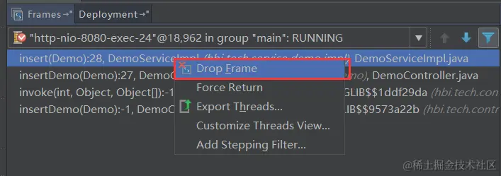 第二种方式,在调用栈方法上选择要回退的方法,右键选择Drop Frame(图8.4),回退到该方法的上一个方法调用处,此时再按F9(Resume Program),可以看到程序进入到该方法的断点处了。