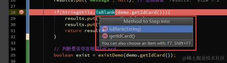 想想,一行代码里有好几个方法,怎么只选择某一个方法进入。之前提到过使用Step Into (Alt + F7) 或者 Force Step Into (Alt + Shift + F7)进入到方法内部,但这两个操作会根据方法调用顺序依次进入,这比较麻烦。