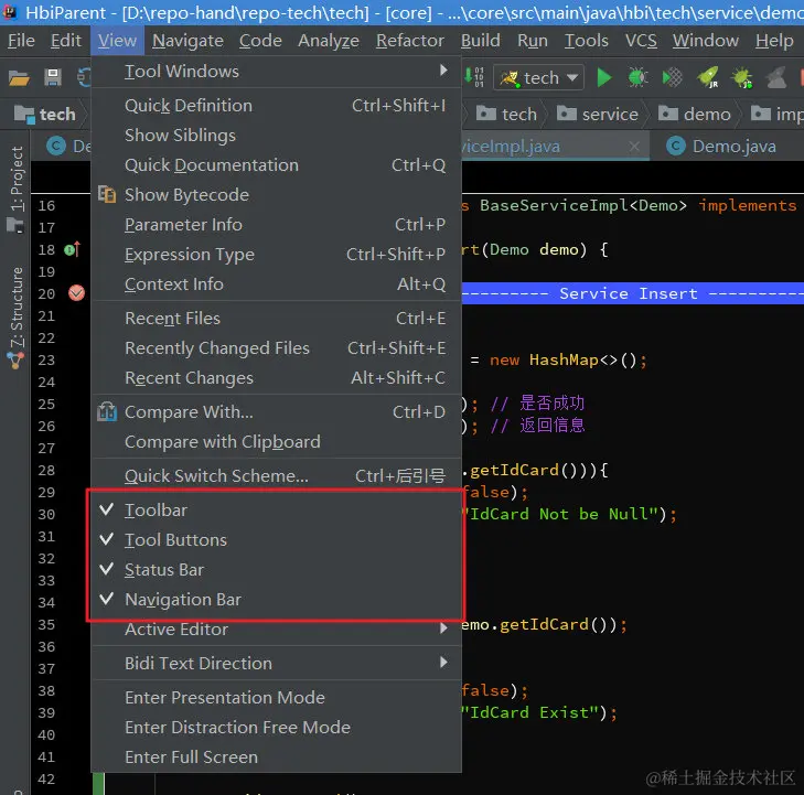如果你的IDEA底部没有显示工具栏或状态栏,可以在View里打开,显示出工具栏会方便我们使用。可以自己去尝试下这四个选项。