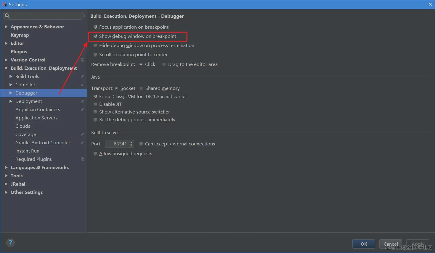 - Debug窗口:访问请求到达第一个断点后,会自动激活Debug窗口。如果没有自动激活,可以去设置里设置,如图1.2。
