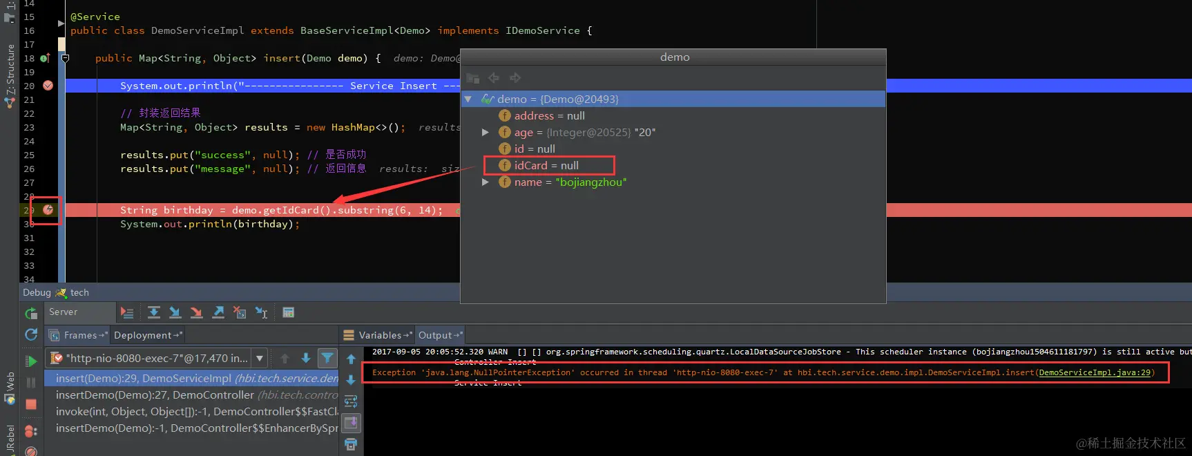 我这里添加了一个NullPointerException异常断点,如图6.8,出现空指针异常后,自动定位在空指针异常行。