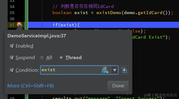 1、在断点上右键直接设置当前断点的条件,如图6.1,我设置exist为true时断点才生效。