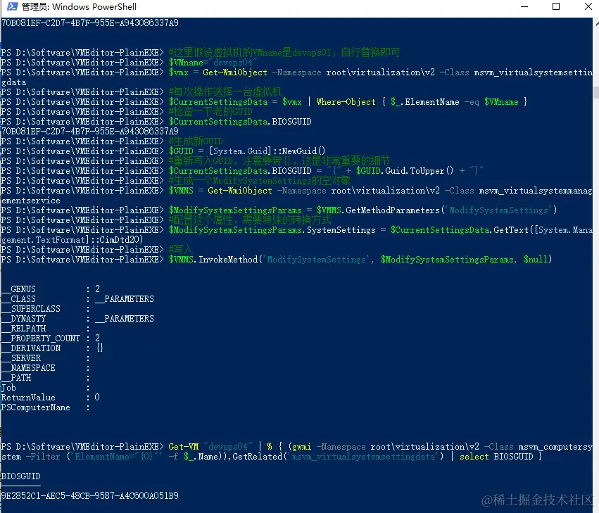 - 终于,皇天不负有心人,在我不停迭代搜索词后,还是让我找到了一篇看得懂行得通的博客 PowerShell修改Hyper-V虚拟机的UUID