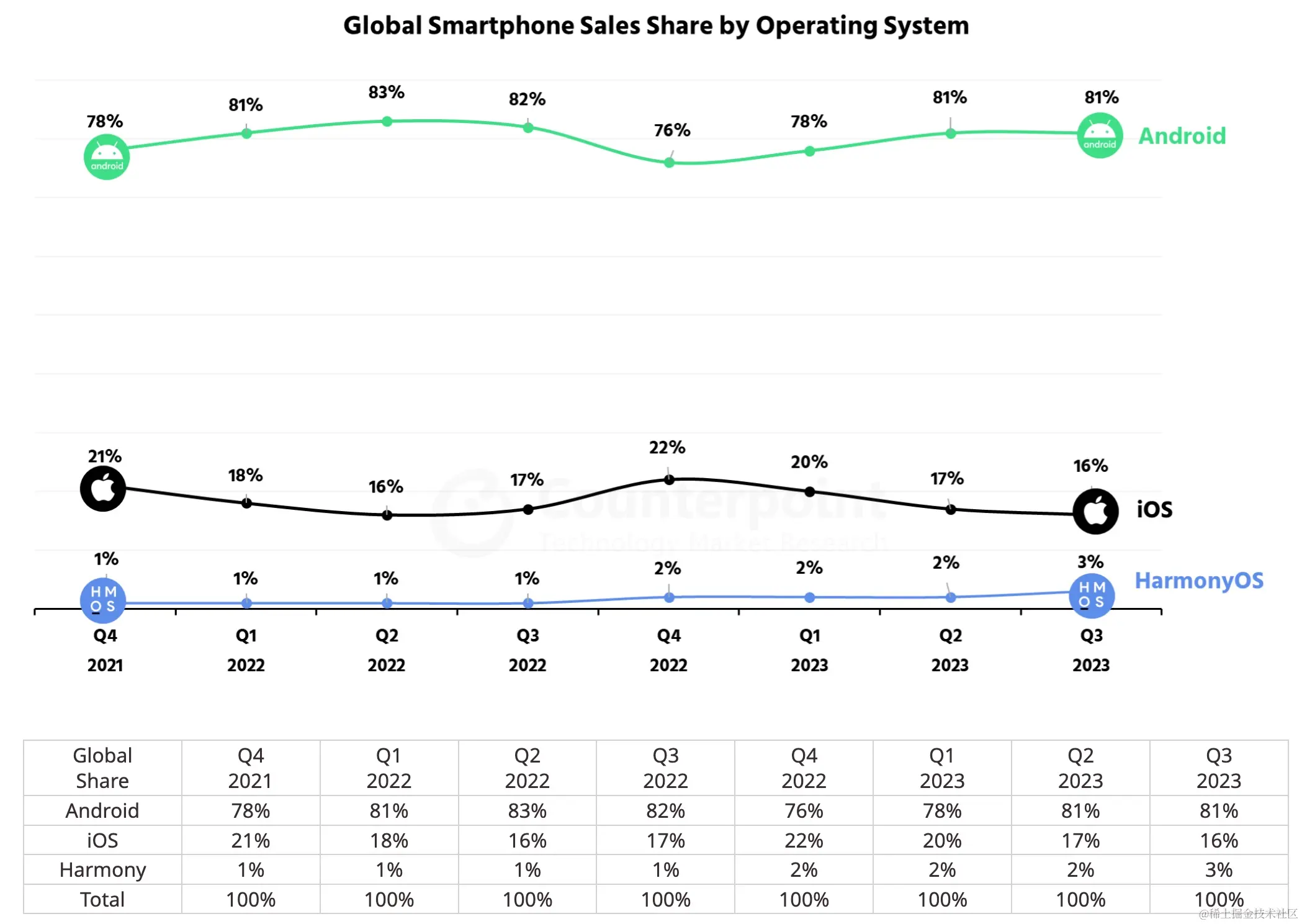 另外根据调研机构 Counterpoint 发布的数据显示,华为 HarmonyOS 出货量仅次于苹果 iOS,晋升成为了全球第三大操作系统。