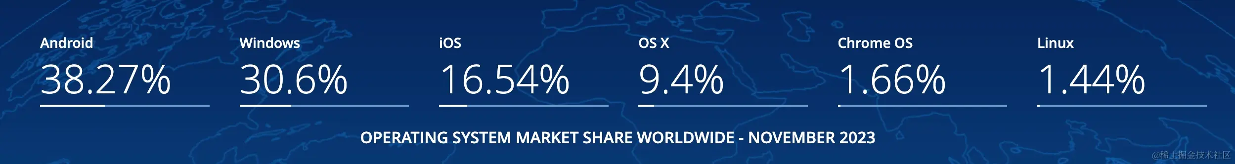 现在国产手机操作的系统的竞争进入了白热化的状态,我们来看一下全球操作系统市场份额。