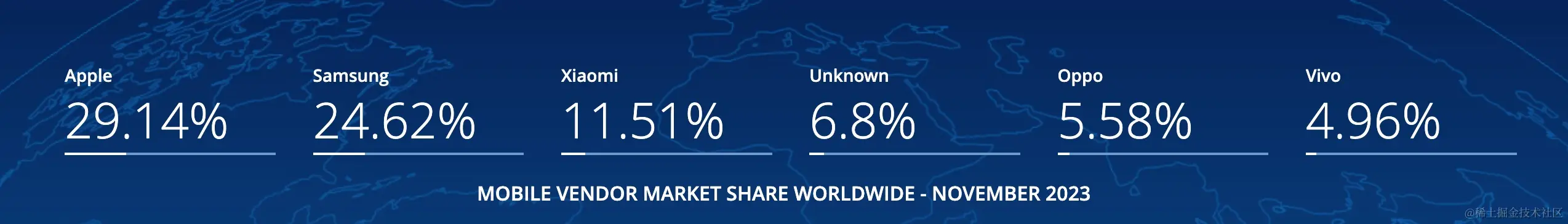 现在全球手机操作系统市场份额是被谷歌的 Android 和苹果的 iOS 基本垄断了,其中 Android 系统占据了 38.27%,我们在来看一下这些 Android 市场份额,被那些手机厂商瓜分了。