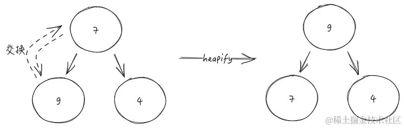 为了满足第二个条件,我们需要对不满足条件的节点的值进行交换操作,这个操作一般称之为heapify