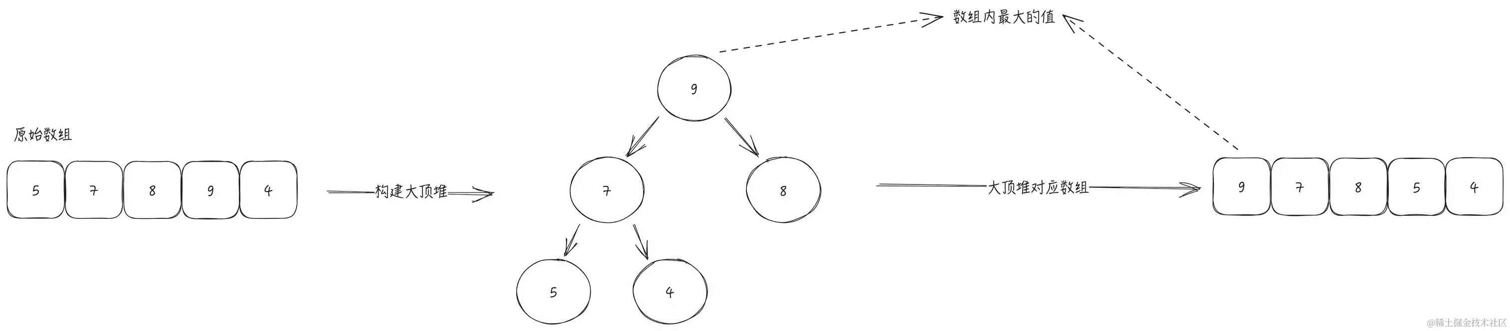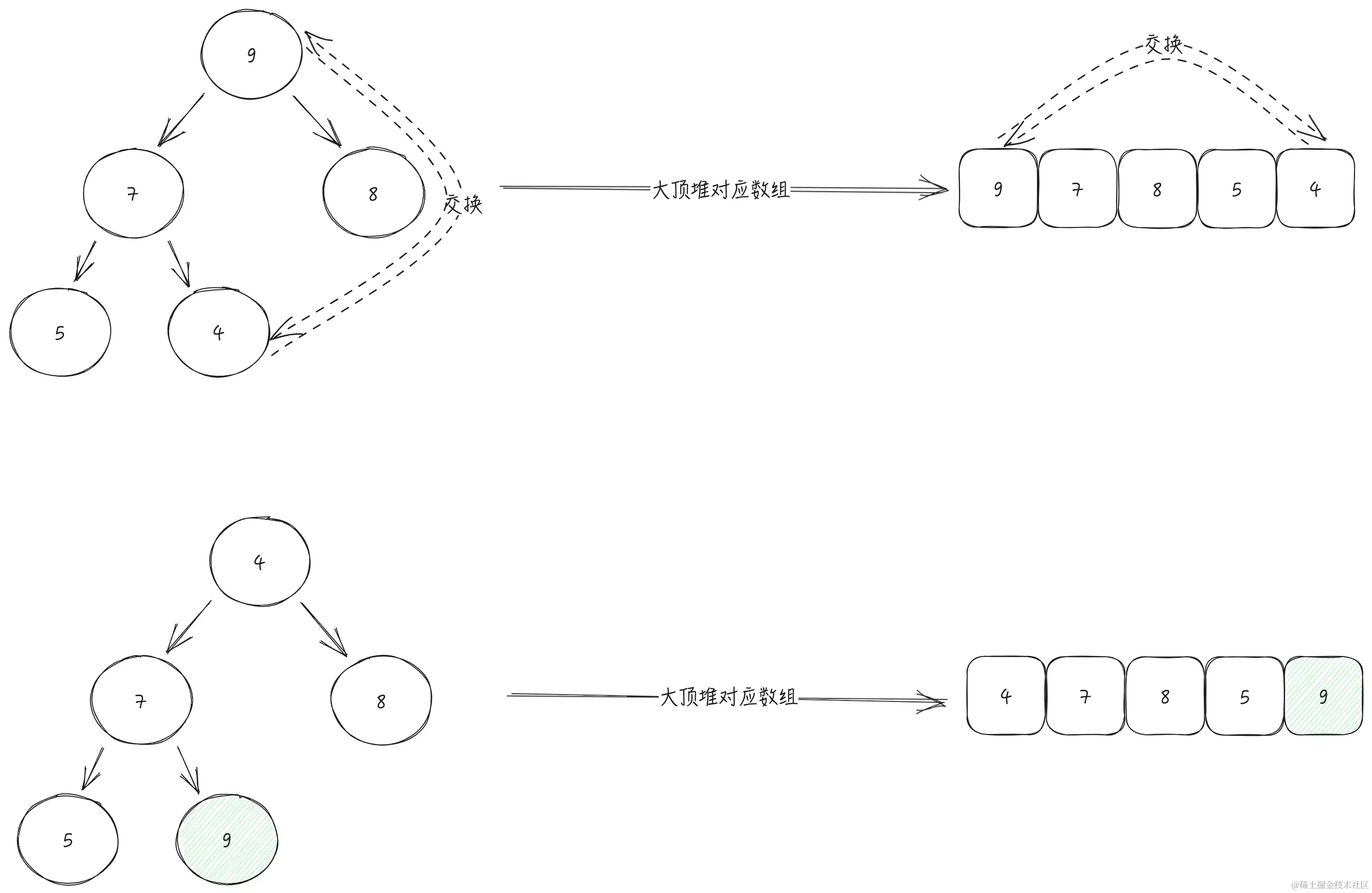 大顶堆的根节点就是数组内最大的值,此时我们交换根节点和最后一个节点,就可以把最大值放到最后一个节点中,也就是数组的最后一个元素