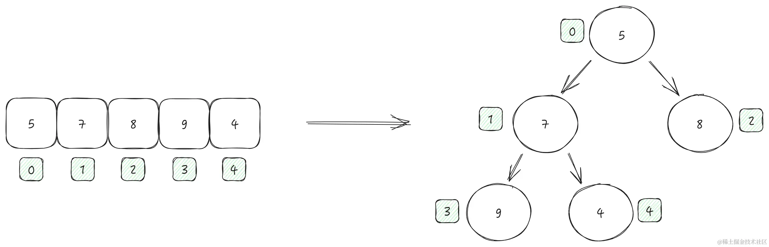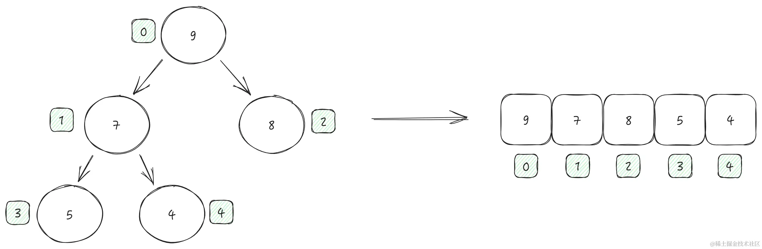 我们从根节点开始,依次给每一个节点添加编号0,1,2,3,4,此时可以用一个一维数组来表示堆