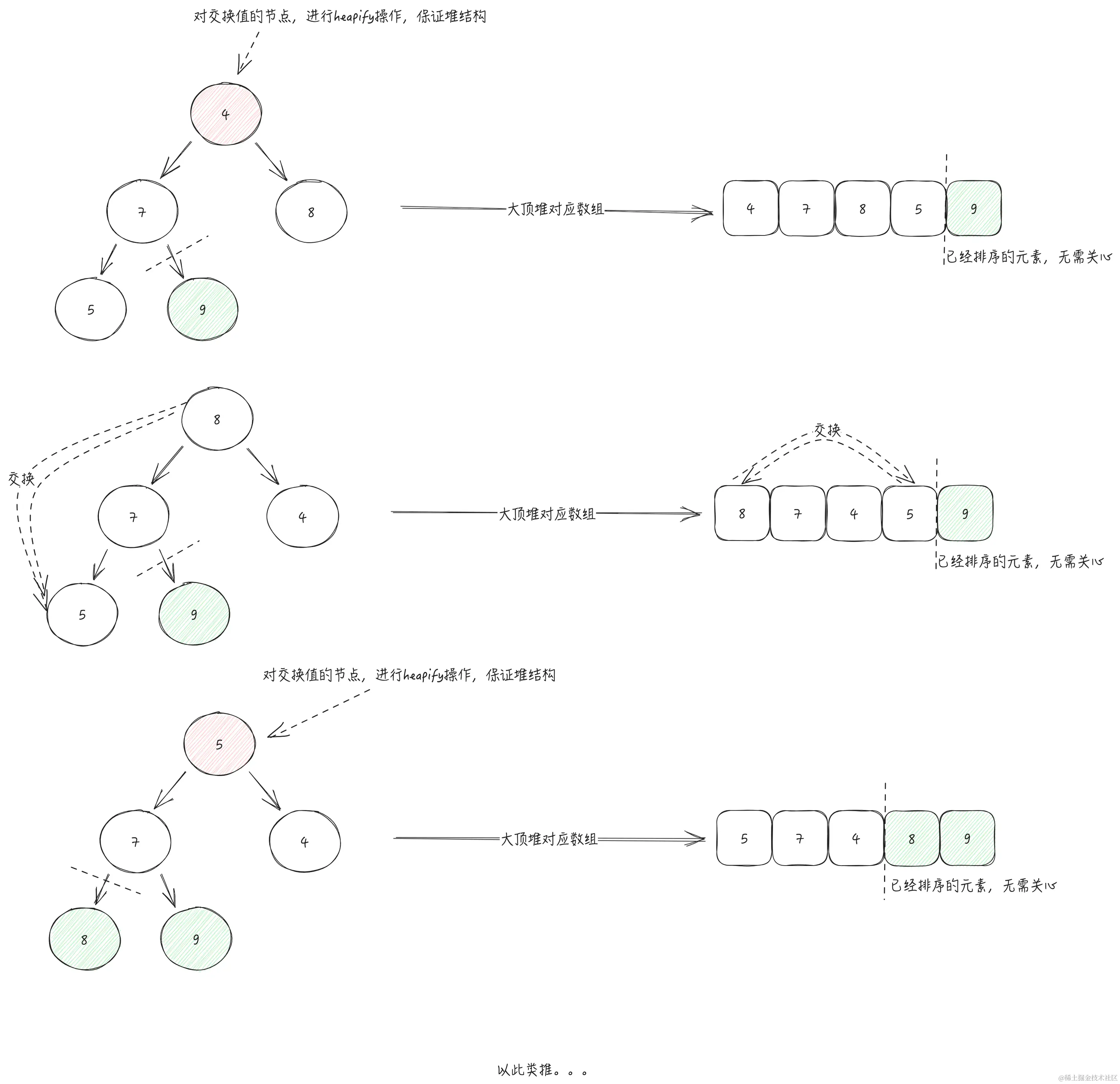 进行完heapify操作后,我们又可以循环进行以上操作,交换,heapify操作。。。