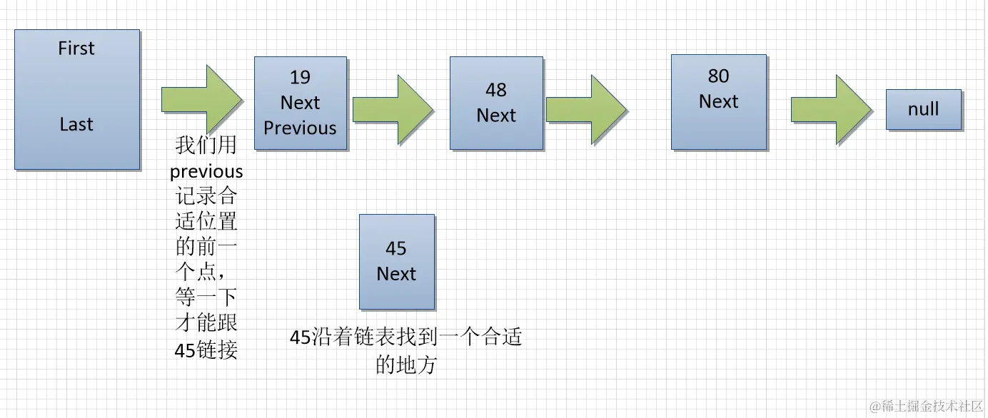 有序链表的关键部分是在于插入,在一个链表中是插入的数据有序比如从小到大,那么每次插入数据时都需要将数据沿着链表移动直到找到一个比它大的数据项,停下来。此时的插入跟上面所讲的链表类型一样,不同的是,在有序链表中我们需要引入一个应用previous,用来记录链接点寻到到合适插入的地方 的 前一项 这样才能使其连接,如图: