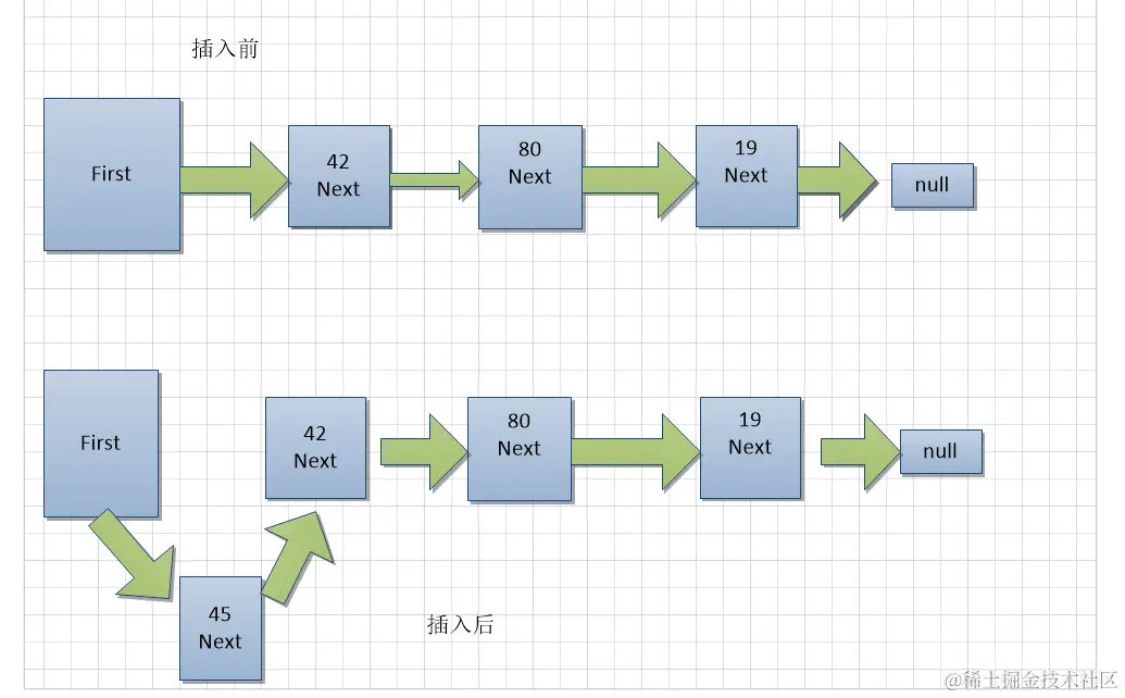 first=newLink;//同理,第一次插入时链表为空要把first引用指向第一个插入的数据