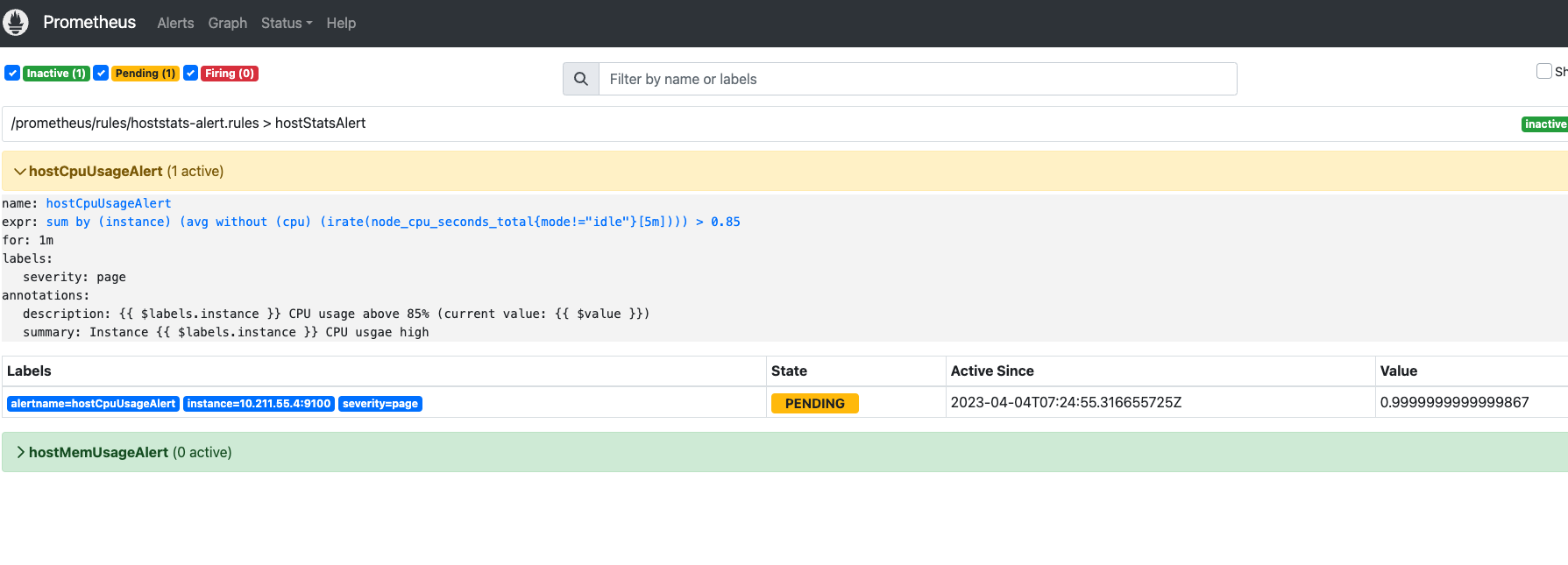 Prometheus首次检测到满足触发条件后,hostCpuUsageAlert显示有一条告警信息,状态为firing表示已经推送给了altermanager