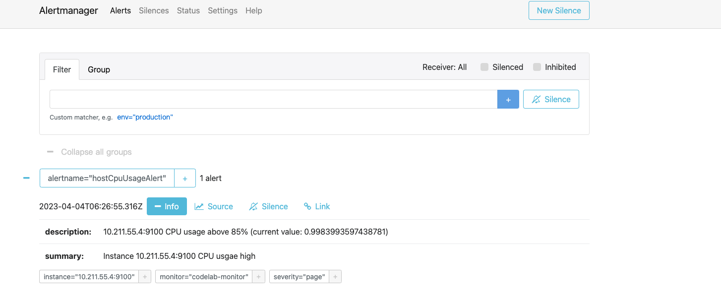 Alert菜单下可以查看Alertmanager接收到的告警内容,Silences菜单下则可以通过UI创建静默规则。