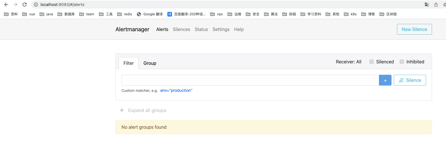 Alertmanager启动后可以通过9093端口访问,http://127.0.0.1:9093