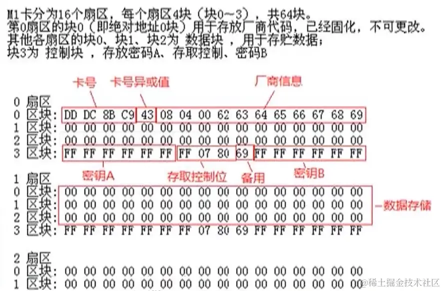 M1卡的结构:含有1K存储空间、分为16个扇区,每个扇区包含两个访问密钥