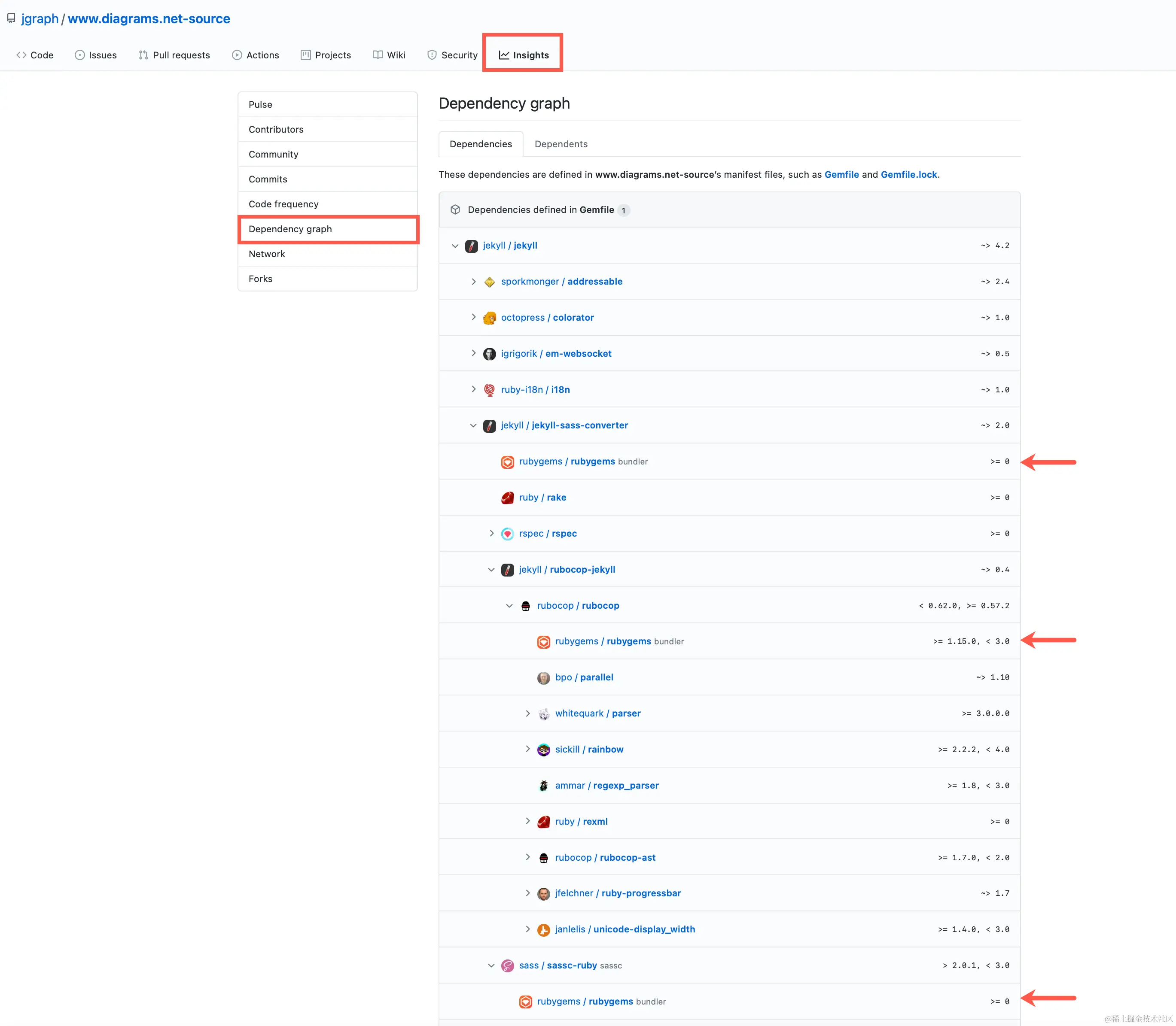 在Github网站的仓库中, 你可以看到网站的构建系统的依赖关系, 在Gemfile和Gemfile.lock清单文件中(在github网站,点击 insights> Dependency graph)。