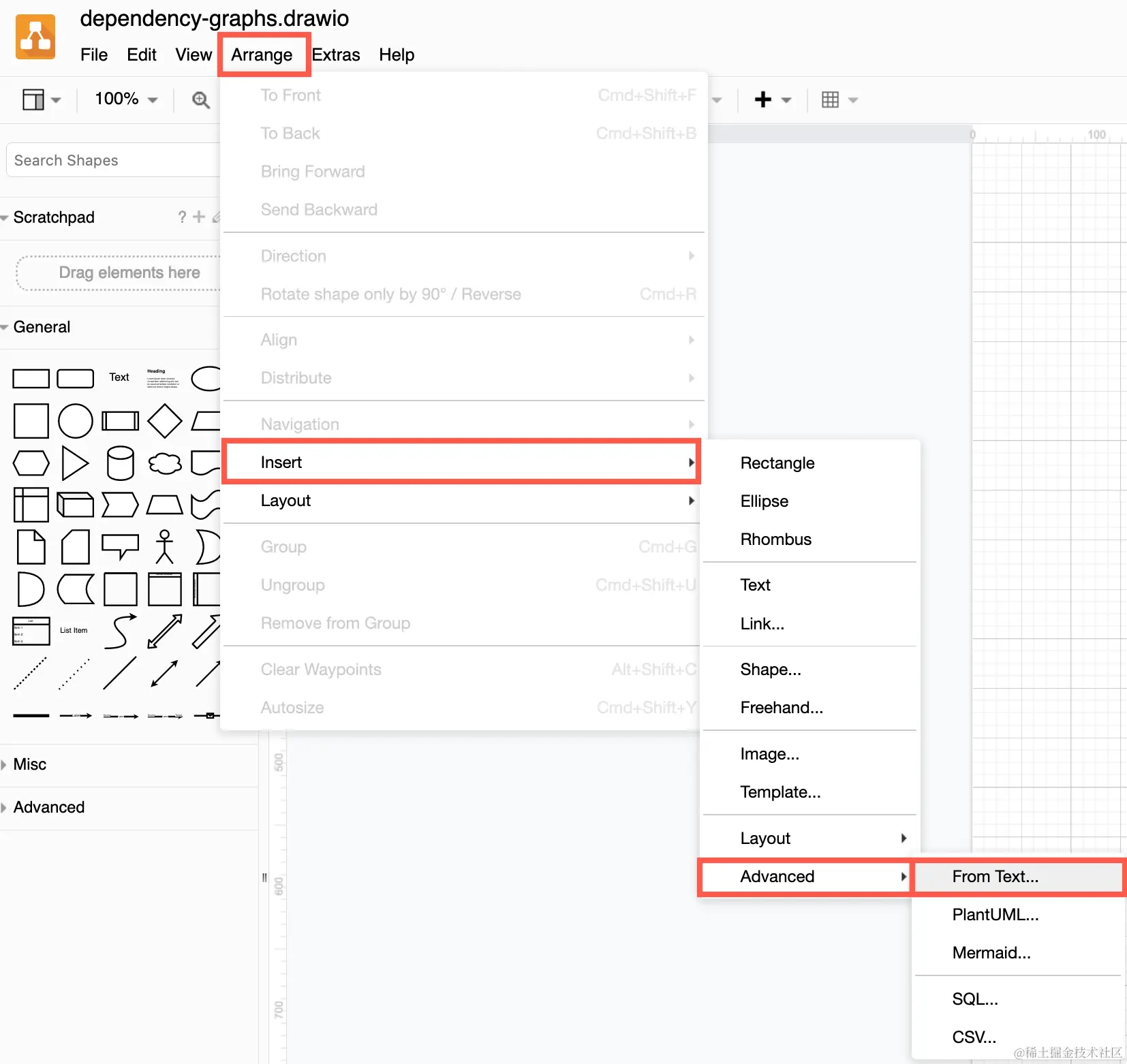 Mermaid 依赖图: 你可以使用Mermaid语法插入一个依赖图。 点击 Arrange> insert > Advanced > Mermaid 打开Mermaid 输入框。