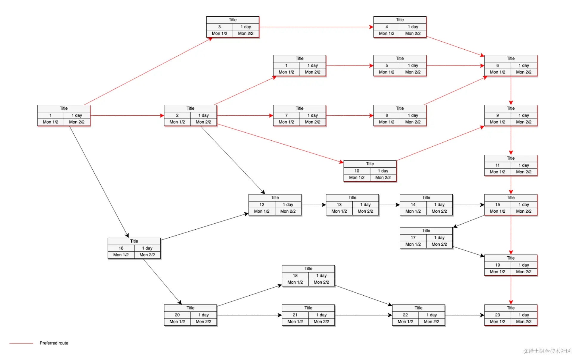 依赖关系图模板(PERT 程序)在drawio的模板库中的商业分类下可以找到。