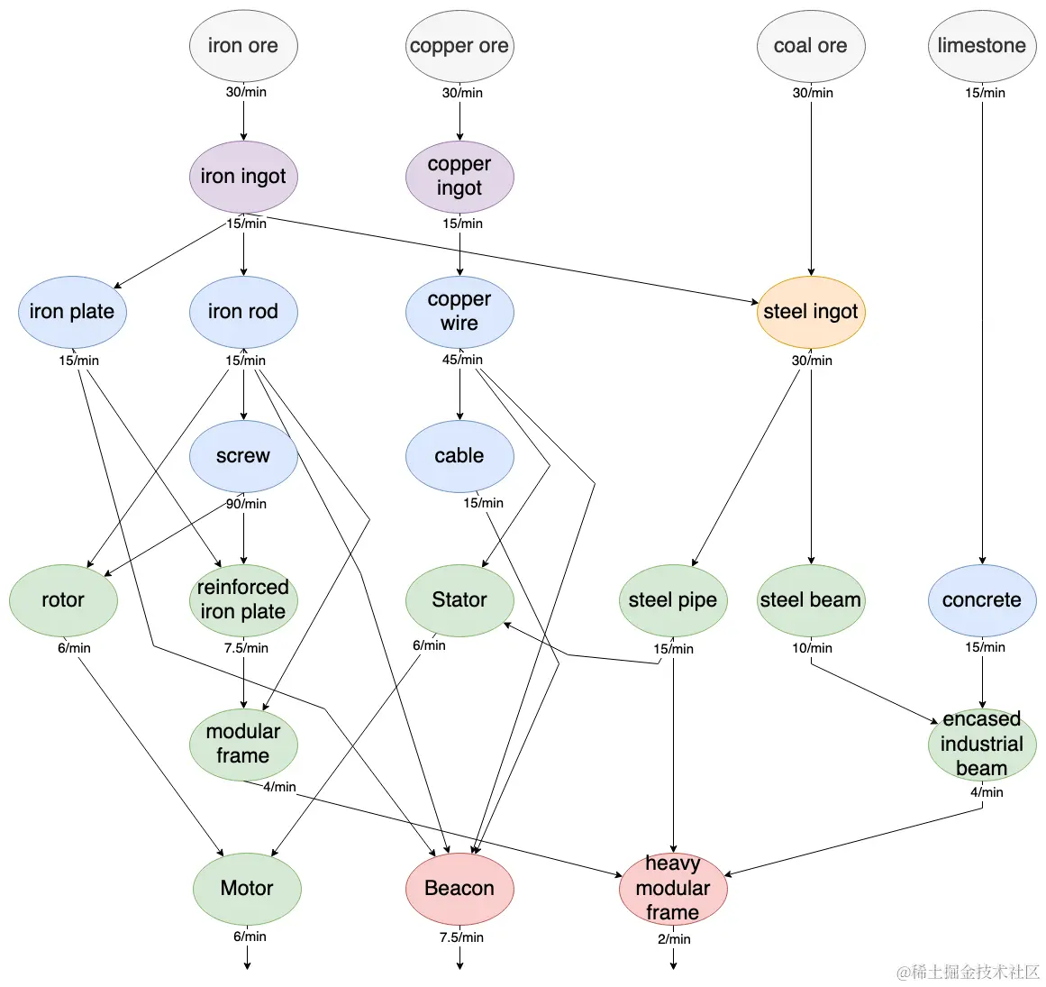具有资源管理和生产链的游戏使用依赖关系图来约束研究和构建顺序,并允许AI“玩家”选择策略和分配资源。下面的例子展示了游戏《Satisfactory》中生产链的一部分,生产速度显示在连接器上。