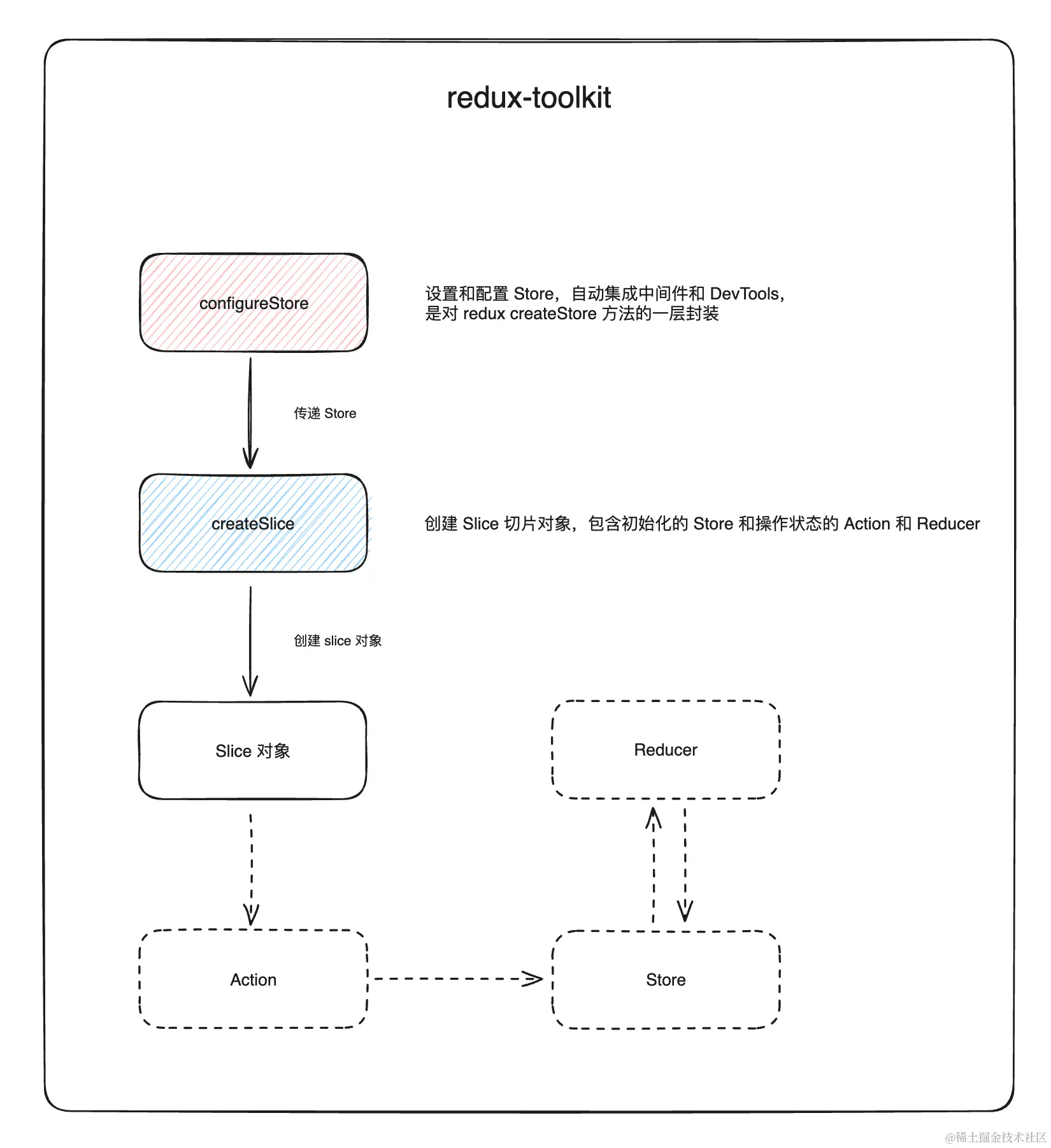 - createSlice:用于创建切片(slice),一个 slice 相当于一个小型的状态操作对象,包括初始化的 State 定义和操作状态的 Action 和 Reducer