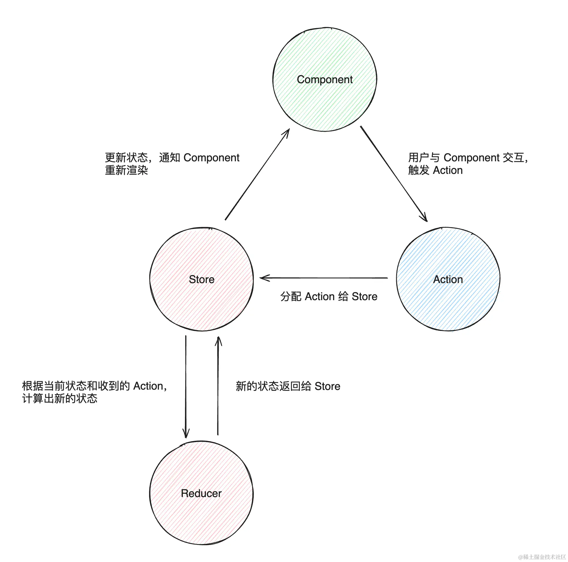 - 核心概念:通过 Store 统一管理状态,通过 Action 描述状态的更新,通过 Reducer 计算出最新的状态