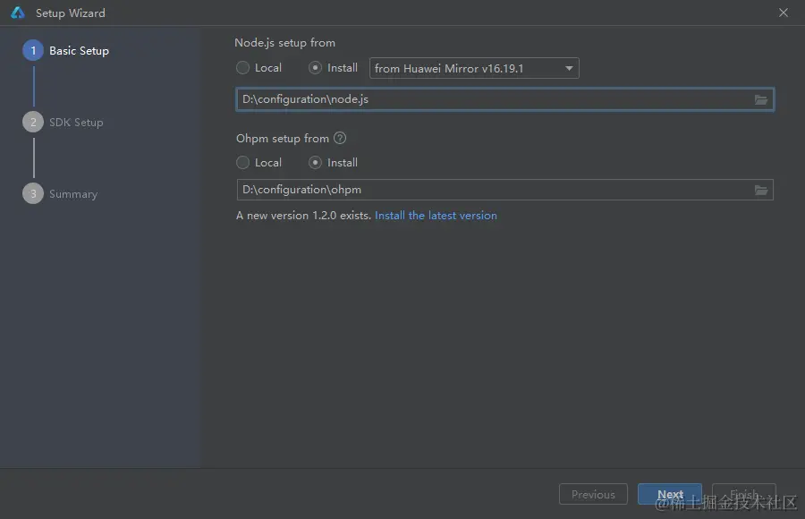 进入 DevEco Studio 配置页面,首先需要进行基础配置,包括 Node.js 与 Ohpm 的安装路径设置,选择从华为镜像下载至合适的路径。