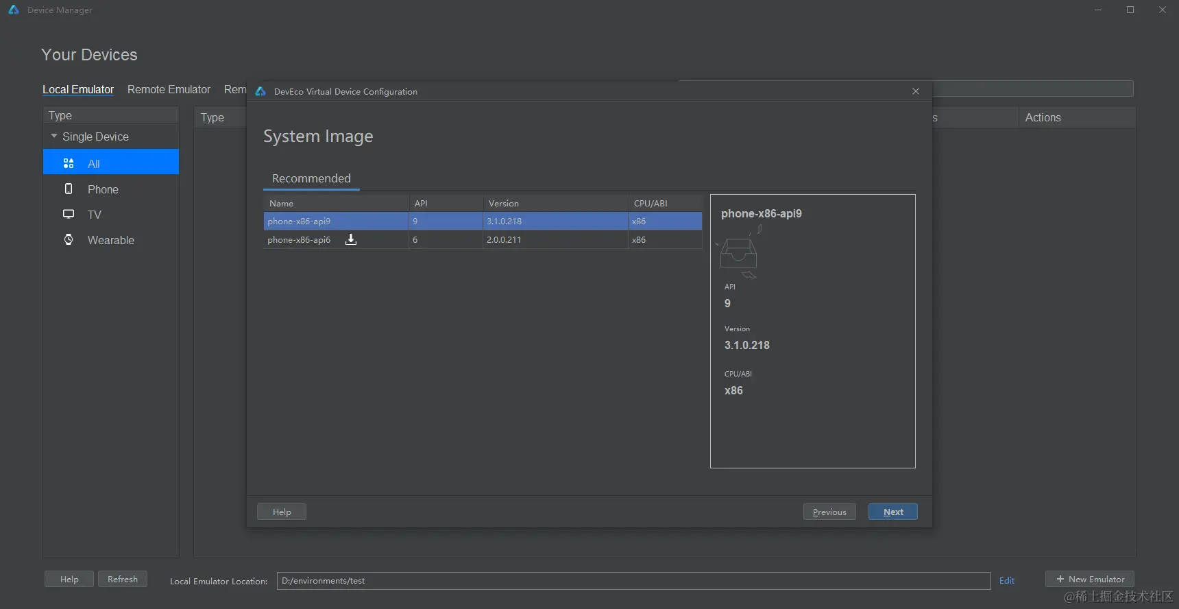 选择 Local Emulator,设置合适的 Local Emulator Location 存储地址,然后单击’+New Emulator’。