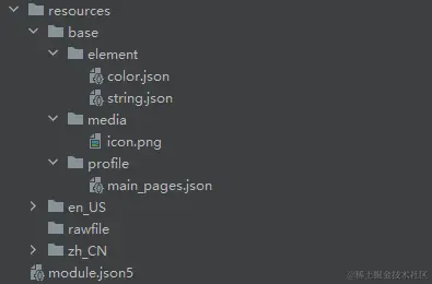 resources 目录下存放模块公共的多媒体、字符串及布局文件等资源,分别存放在 element、media 文件夹中。