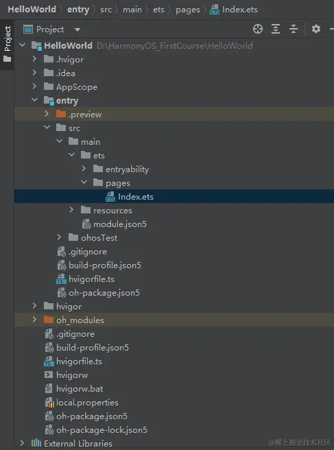 - entry 是应用的主模块,存放 HarmonyOS 应用的代码、资源等。