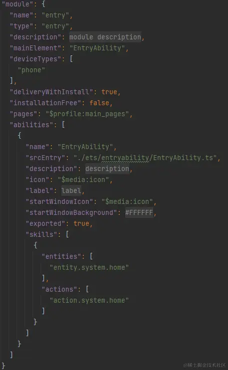其中 module 对应的是模块的配置信息,一个模块对应一个打包后的 hap 包,hap 包全称是 HarmonyOS Ability Package,其中包含了 ability、第三方库、资源和配置文件。其具体属性及其描述可以参照下表 1。