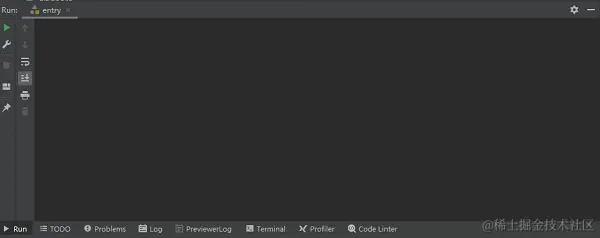 在编辑器底部有一行工具栏,主要介绍常用信息栏,其中 Run 是项目运行时的信息栏,Problems 是当前工程错误与提醒信息栏,Terminal 是命令行终端,在这里执行命令行操作,PreviewerLog 是预览器日志输出栏,Log 是模拟器和真机运行时的日志输出栏。在后续使用中会陆续接触。