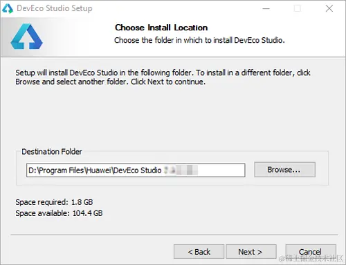 下载完成后,双击下载的“deveco-studio-xxxx.exe”,进入 DevEco Studio 安装向导,在如下界面选择安装路径,默认安装于“C:\Program Files”下,也可以单击“Browse...”指定其他安装路径,然后单击“Next”。