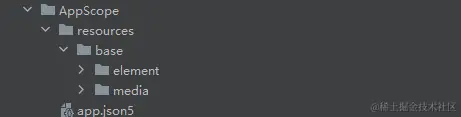 在 AppScope,其中有 resources 文件夹和配置文件 app.json5。AppScope>resources>base 中包含 element 和 media 两个文件夹,