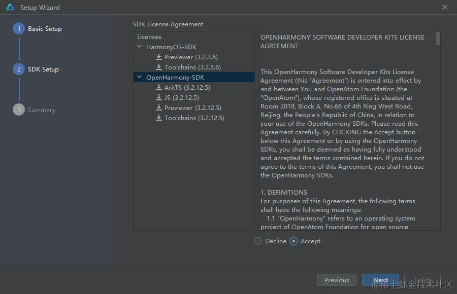 点击'Next'后会显示'SDK License Agreement',阅读相关协议后,勾选'Accept'。