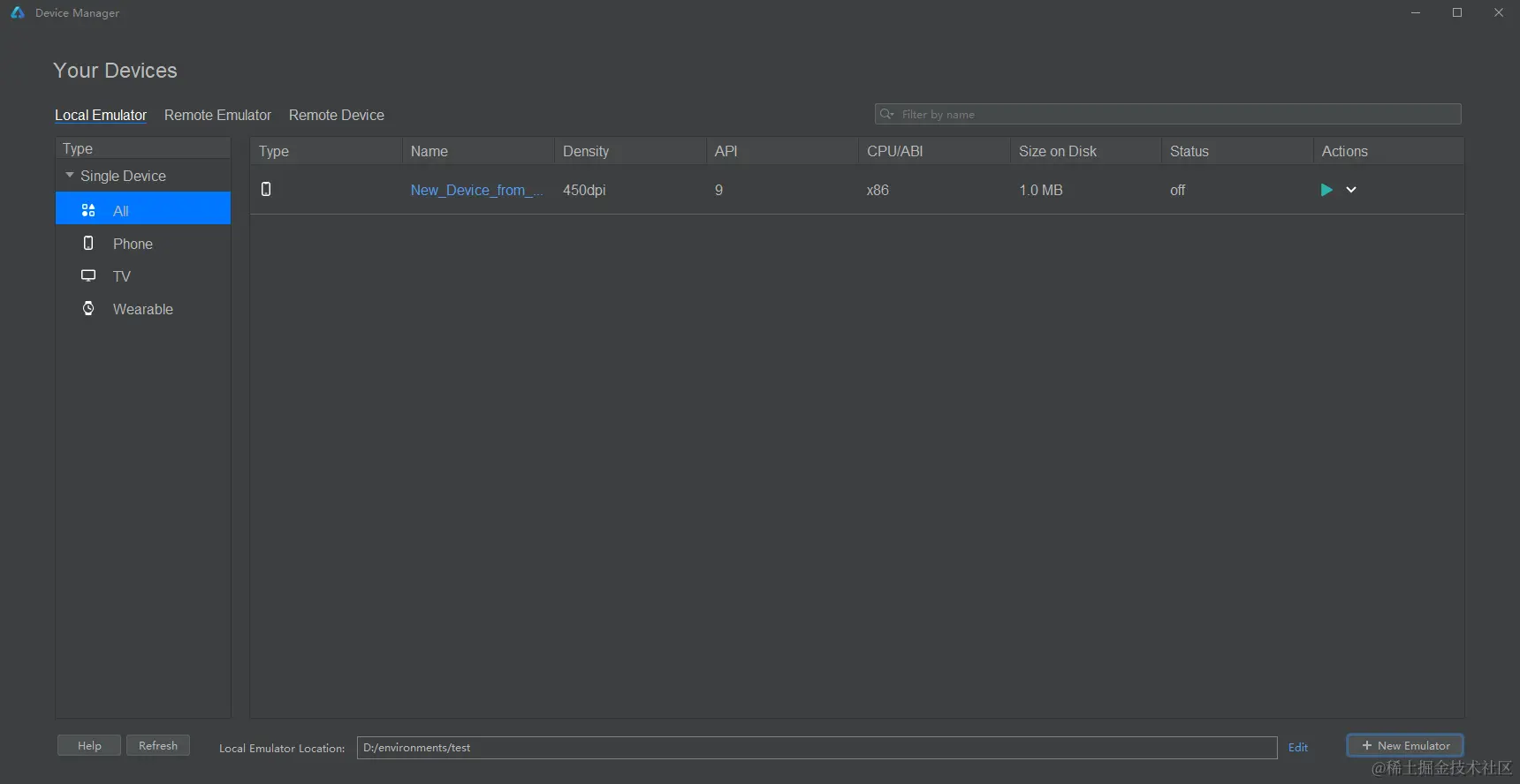 下载完成后,在 Local Emulator 页面中会出现创建的手机模拟器,点击 Actions 按钮,就能够启动模拟器。
