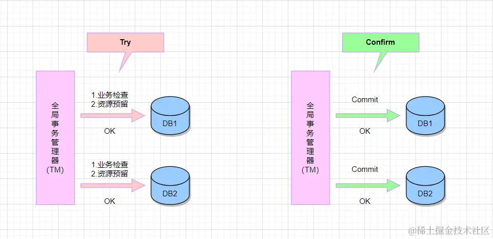 1. Try阶段: 用于业务检查(一致性)及资源预留(隔离),此阶段仅是一个初步操作,它和后续的Confirm 一起才能真正构成一个完整的业务逻辑。