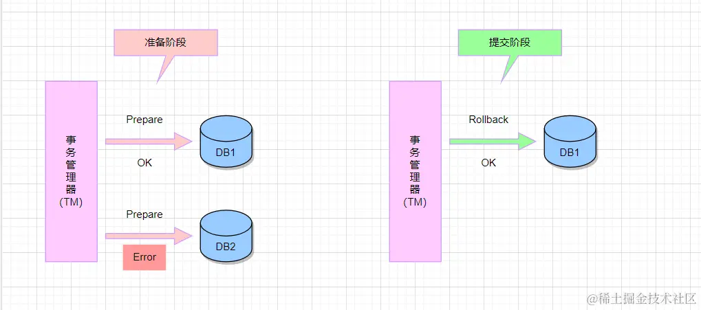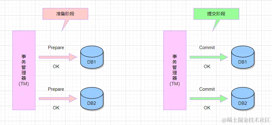 - 一致性: 2PC的设计目标之一是保证事务的一致性。在正常情况下,如果一个参与者已经准备好,那么整个事务将被提交,否则将回滚。