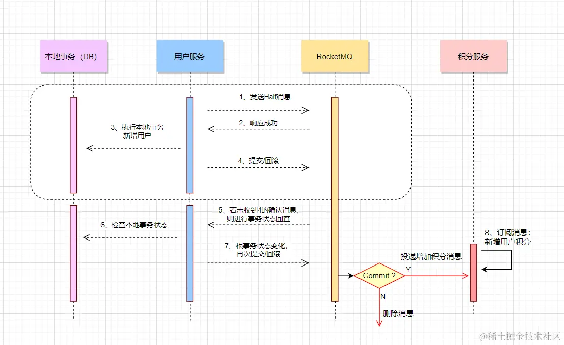 以上由RocketMQ实现主干流程,可以看到,用户只需要分别实现本地事务执行以及本地事务回查方法,因此只需关注本地事务的执行状态即可。
